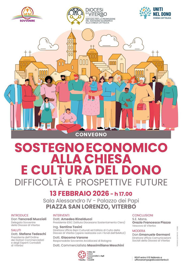 “Sostegno economico alla Chiesa e cultura del dono. Difficoltà e prospettive future” è il titolo di un Convegno organizzato dalla Diocesi di Viterbo e in particolar modo dal Servizio diocesano per la Promozione del Sostegno Economico alla Chiesa cattolica. L’evento si terrà nella Sala Alessandro IV (Palazzo dei Papi) in Piazza San Lorenzo (VT) il prossimo 13 febbraio dalle ore 17.00 alle 19.30.